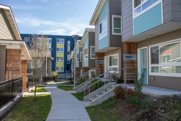Built in 2016, the complex includes 15 units, a playground, and a service center equipped with meeting rooms, computers, laundry, a shower, and a book nook for children. Prairie Oaks complies with Evergreen Sustainable Development Standards, as well as the MBE/WBE goals set by THA.