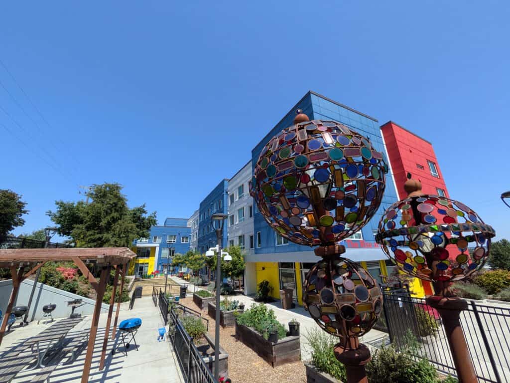 The Rise features 64 beautiful, modern apartments with amazing views, family-friendly amenities, and a beautiful outdoor art piece titled “The Jewels,” created by Diane Hansen. Fourteen 1- and 2-bedroom units are reserved for veterans exiting homelessness, and another 14 units are reserved for people with physical disabilities.